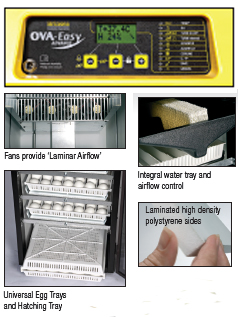 The OvaEasy models have fully protected steel chassis which are rigid and rust resistant with laminated high density polystyrene sides providing good thermal insulation and smooth, easy to clean surfaces. The transparent, double glazed door provides thermal insulation plus the convenience of total visibility of eggs and hatched chicks.
