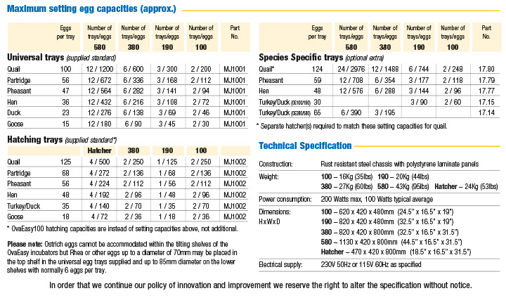 Eggs are held in removable trays. As standard the incubators are supplied with universal egg trays with adjustable dividers allowing the user to efficiently fit a wide range of egg sizes from quail to goose, although at a cost of maximum capacity. For maximum capacity optional species-specific egg trays are required (see capacity table).
