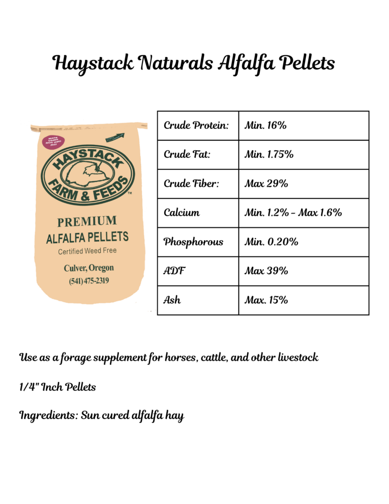 Haystack Naturals Non-GMO and certified weed free Alfalfa Pellets are made from sun cured central Oregon alfalfa and bound together with a steam process to provide an all natural forage supplement.